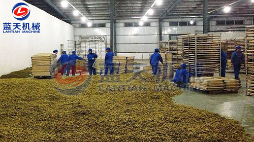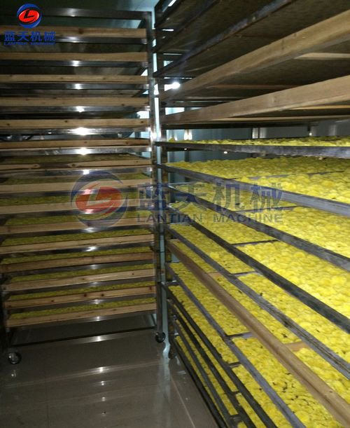 第三步——烘干,將烘車推入烘房,關(guān)閉烘房門,打開烘干機(jī)電源。這里以藍(lán)天機(jī)械烘干機(jī)為例設(shè)置烘干參數(shù),第一段8小時(shí),溫度45℃,第二段8小時(shí),溫度50度,第三段6小時(shí),溫度55度。設(shè)置完畢,返回初始界面,點(diǎn)擊開機(jī)即可。設(shè)備會自動運(yùn)行,注意每隔8小時(shí)要觀察一下金絲皇菊烘干情況。待烘房濕度降至13%左右即可出爐。