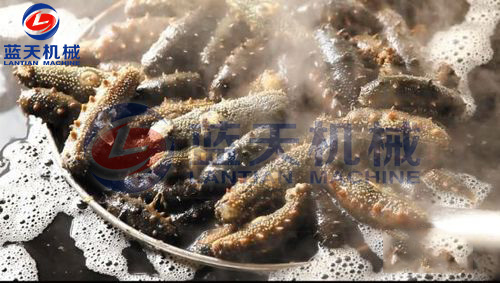第三步:蒸煮海參:當(dāng)水溫在90度時(shí),將清洗好的海參放入鍋里蒸煮,用工具來(lái)回?cái)嚢瑁乐顾疁夭痪?,這時(shí)可見(jiàn)到海參迅速縮小,海參刺明顯突出。約半小時(shí)后,撈出海參,視情況拌入粗鹽。