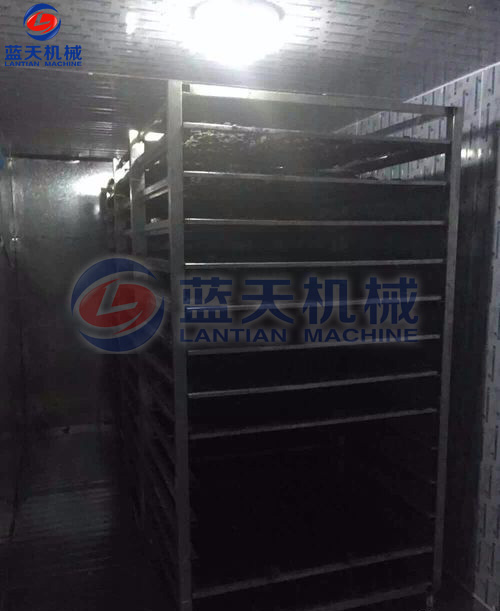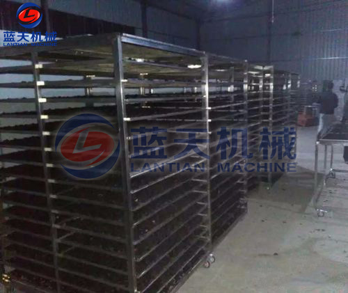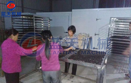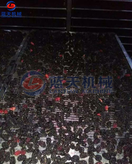 桑葚裝盤:使用桑葚烘干機(jī)干燥處理,時間要18個小時就可以干燥處理完了。一般每4公斤鮮桑葚可制成1公斤桑葚干。將經(jīng)整理去雜后的桑葚裝篩子,裝入物料車內(nèi)。每臺物料車不宜超過14個篩子,篩子層間距控制在10公分左右。以10P機(jī)為例,不要超過10臺物料車,以保證烘干房內(nèi)有合理間隙位,利于熱風(fēng)通過。
