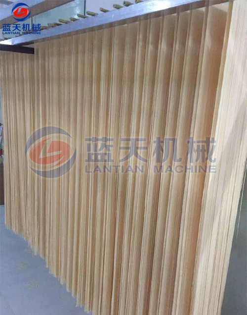 有些掛面容易在烘干過程中容易斷,有些不容易斷(玉米淀粉有幫助?。行┎荒苣褪軠囟?,溫度一高就容易斷,如果用太陽曬的話,盛夏上午10點鐘的太陽就能把掛面曬斷。有些溫度可以高一些。有些掛面一定要大量的風(fēng)量,否則中間的掛面就酸掉了!面條烘干機系統(tǒng)設(shè)計中非常重要的環(huán)節(jié)就是風(fēng)路設(shè)計,對于大部分掛面的烘干來說,使用頂出風(fēng)機組再結(jié)合上下風(fēng)路更利于風(fēng)路循環(huán),更利于面條的烘干。