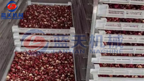 第三步:新鮮山楂片的含水率約為80%,干燥的目標(biāo)含水率約為13%,使用空氣能熱泵型烘干機(jī),將智能溫度設(shè)定為55°C左右的范圍,使山楂片所含的游離水大量蒸發(fā),熱風(fēng)循環(huán)系統(tǒng)不斷輸送新風(fēng),將風(fēng)量均勻的輸送至各層架,排風(fēng),促使蒸發(fā)的水份通過凝結(jié)水管路系統(tǒng)排出。
