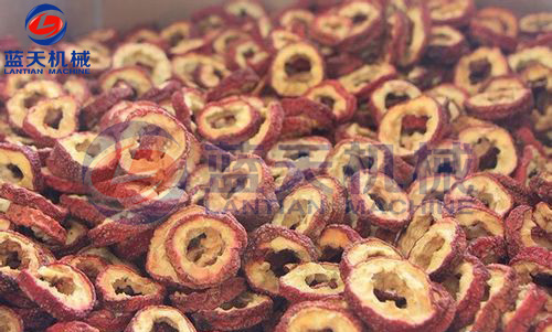 第二步:洗凈山楂果后,要盡快擦干其外表的水分,再進(jìn)行切片處理,需要去除或保留果核?,F(xiàn)在也有專門的切片機(jī)器,效率很高,且切片的厚薄均勻,一般在3mm左右。