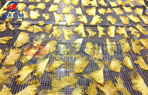第三步:切好的菠蘿片進(jìn)入熱泵烘干系統(tǒng)里烘干的過程,可以分成5段完成,第一段,烘干,不除濕,時(shí)間1.5個(gè)小時(shí),內(nèi)外溫度一致,溫度50度,第二階段,溫度53度,開始連續(xù)除濕,除濕到40%,第三階段溫度58度,連續(xù)除濕,濕度26%,第四階段溫度55度,濕度20%,連續(xù)除濕,第五段溫度48度,濕度18%,連續(xù)除濕1小時(shí),烘干完成。