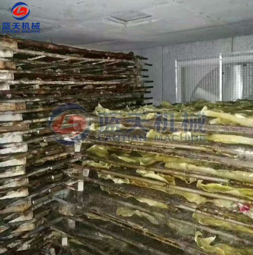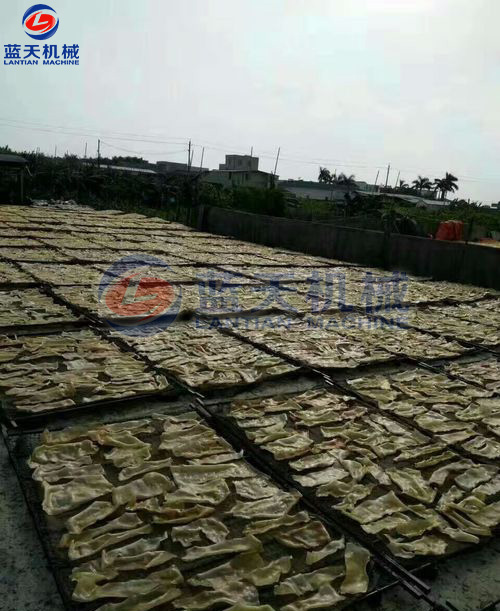 是利用太陽曬干的,整個(gè)過程需要持續(xù)四五天的時(shí)間,還需要工人在現(xiàn)場看管,但也避免不了蟲蟻灰塵的污染。如遇上陰雨天,豬皮曬干不及時(shí)就可能走味,給豬皮的干燥帶來諸多麻煩。