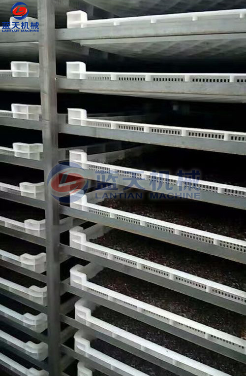 裝滿花蕾的物料車要輕輕推入烘干房,關(guān)閉烘干房室門升溫,嚴(yán)格控制室內(nèi)溫度、依次順序溫度慢慢提升,采用循環(huán)風(fēng)路,確?;ɡ俑蓾窬鶆?,色澤鮮艷。