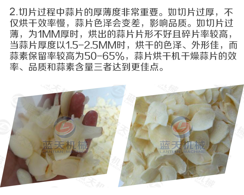 8、切片時(shí)可以選用切片機(jī),切出大蒜的厚薄均勻平整,這樣烘干后的大蒜片成品質(zhì)量均勻,不會參差不齊。