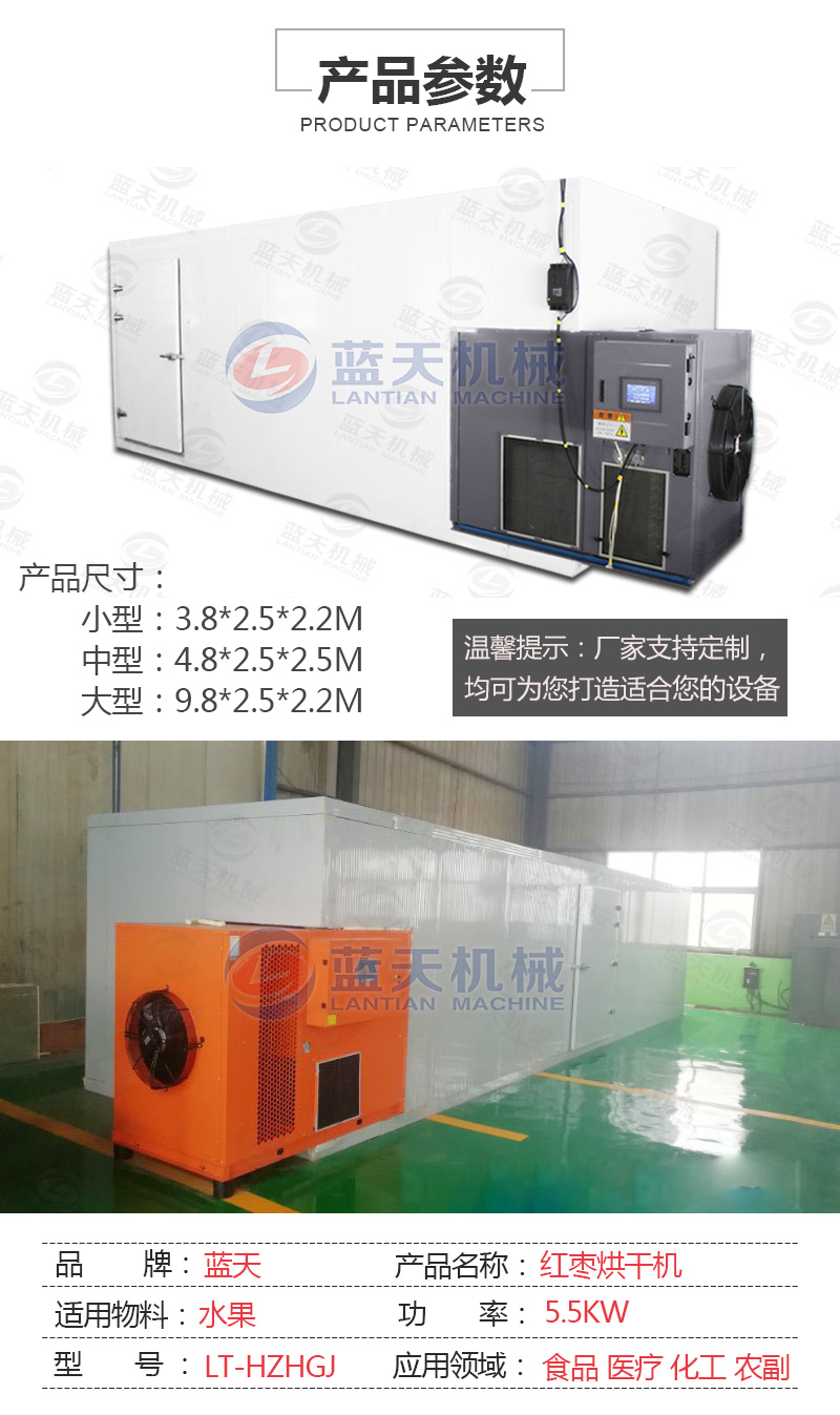 紅棗烘干機(jī)采用空氣能熱泵來烘干紅棗等農(nóng)產(chǎn)品很合適,機(jī)器綠色環(huán)保節(jié)能,使用電能要比電熱管烘干箱烘烤設(shè)備少30%-40%。