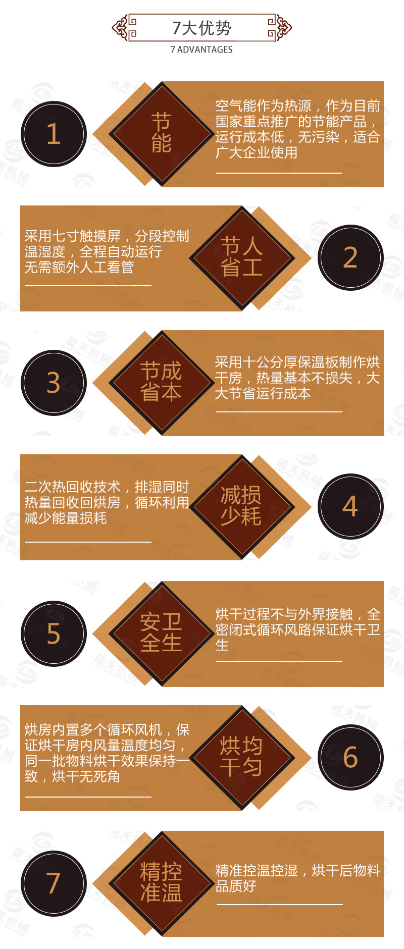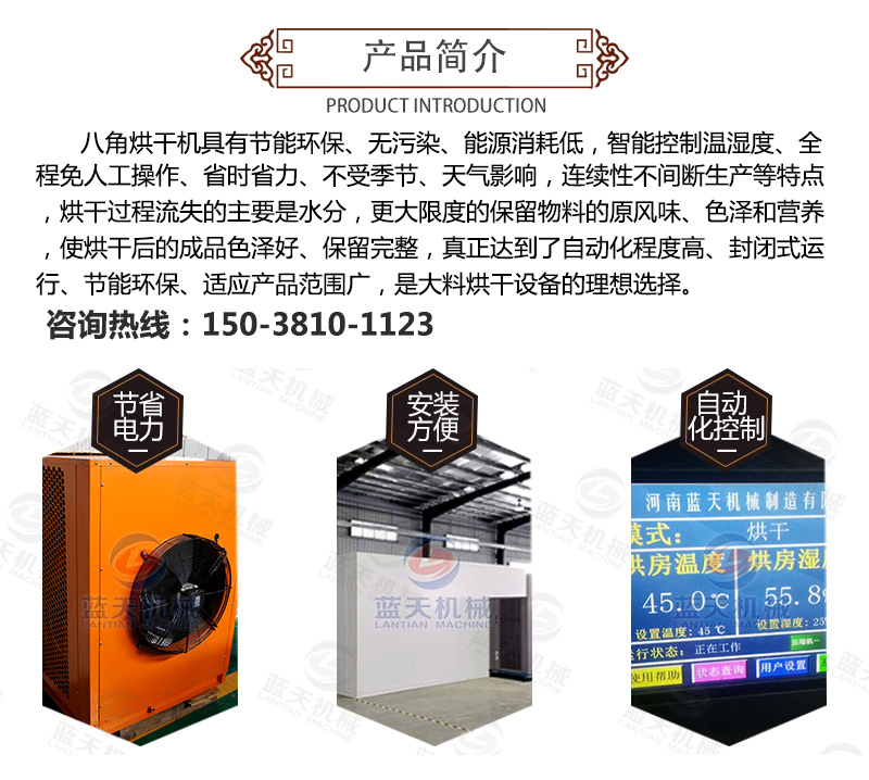 結合以上問題,新的八角烘干機出現(xiàn)了,這種設備是通過少許電能驅動壓縮機做功,從而使系統(tǒng)中的冷媒吸熱放熱來實現(xiàn)熱量從高位轉移到低位的新能源設備,是一種氣流干燥設備,節(jié)能環(huán)保,智能化控制,不再看天氣,不再需要人守著,一鍵啟動,自動烘干,自動停機。