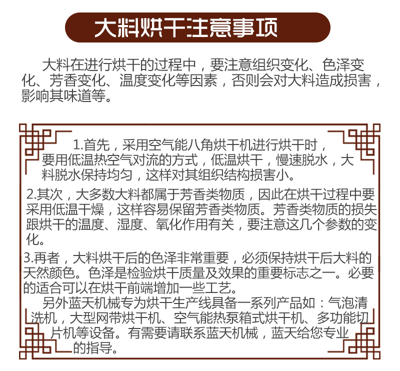 有的客戶八角產量數(shù)萬噸,如果選用大型八角烘干機,在幾天-1個月的時間內就可以完成全部八角的烘干,且大型八角烘干機的烘干效果很棒,色澤、破損率、香味都保持的不錯。講到這里,大家應該就會知道八角烘干機有不同型號的,那對八角烘干機多少錢來說,就是看機型而異了,如果您對八角烘干機感興趣有需要,歡迎您聯(lián)系我們進行咨詢。