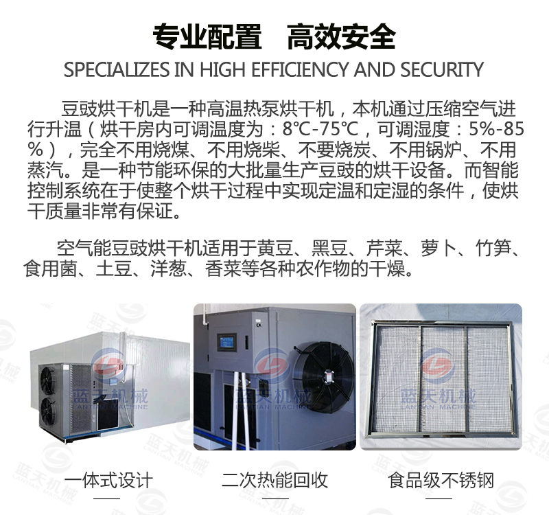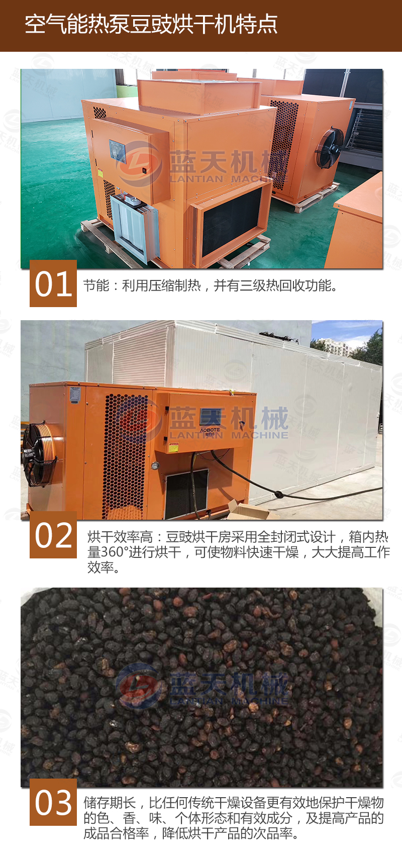 豆豉富含蛋白質、各種氨基酸、乳酸、磷、鎂、鈣及多種維生素,色香味美,我國南北部都有加工食用。但若不注意加工藝,會致使品質下降,甚至霉變,造成經(jīng)濟損失。傳統(tǒng)上使用太陽光曬制,但是生產(chǎn)效率低下,并且在曬制過程中極容易有污染,本文介紹使用一種基于空氣能熱泵技術的豆豉烘干設備,大大加快了豆豉的生產(chǎn)流程。
