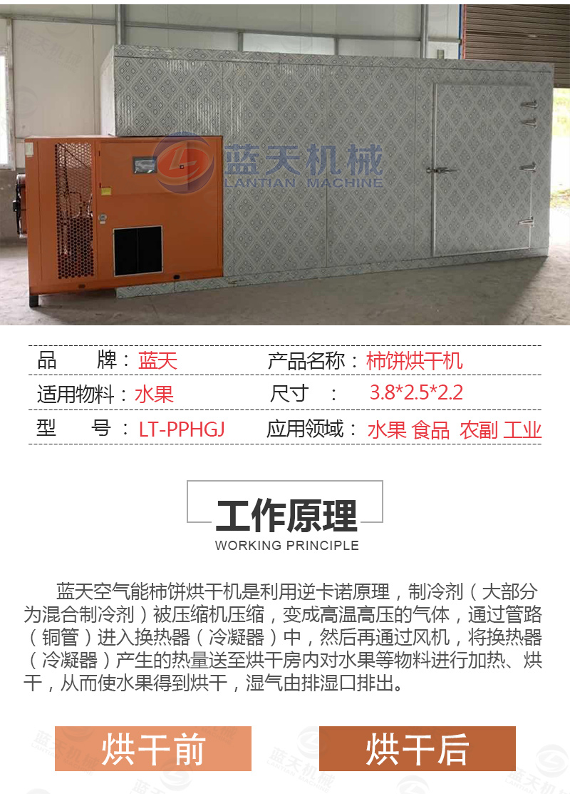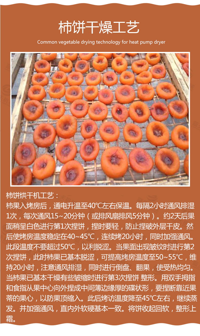 目前,國內(nèi)柿餅烘干加工工藝主要采取自然干制的傳統(tǒng)民間加工工藝。其主要流程為選果、去皮、日曬壓捏、脫色、捏曬整形、定型出霜然后包裝。由于自然干制的方法生產(chǎn)周期長,同時因長達(dá)數(shù)月的自然晾曬,微生物污染嚴(yán)重,因此產(chǎn)品的衛(wèi)生質(zhì)量差,自然干制還有占地多、用人多、用時長等缺點,我們對柿餅用熱泵烘干的進(jìn)行研究,有了柿餅烘干機的產(chǎn)生,并取得突破性的成果。