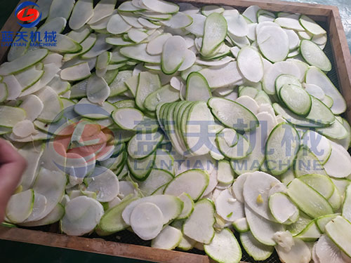 3、經(jīng)過前兩道工序后,把蘿卜片平鋪在蘿卜片烘干機的物料托盤上,推進蔬菜烘干機進行烘干